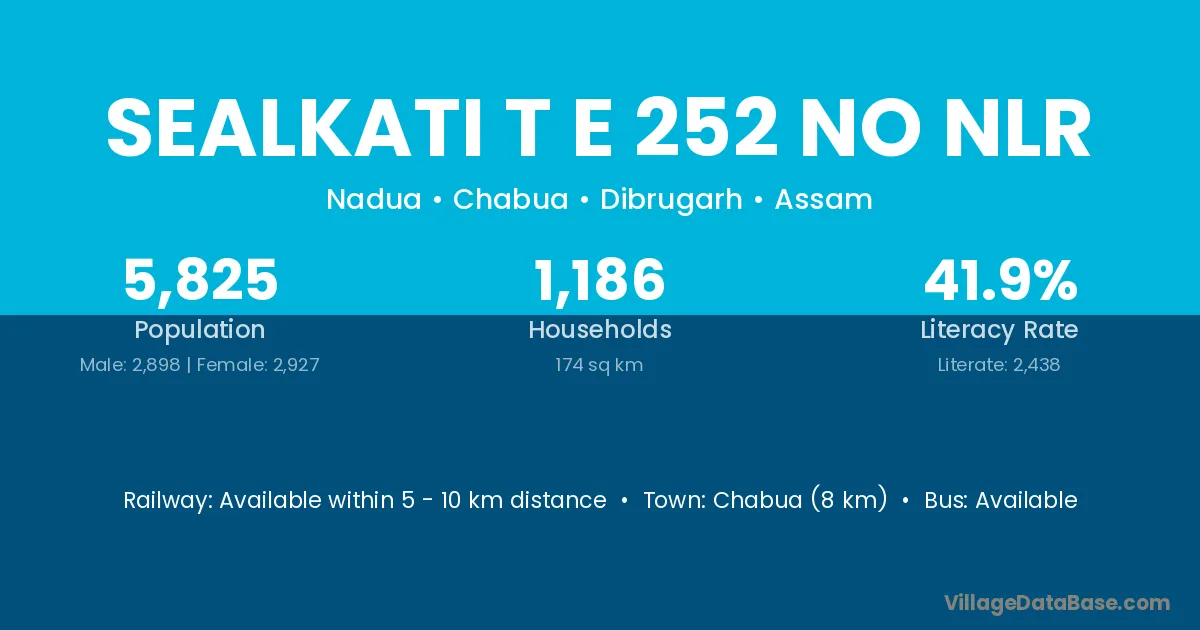 Chabua (8 km) is the nearest town to Sealkati T E 252 No Nlr village for major economic activities and is located approximately 8 km away.