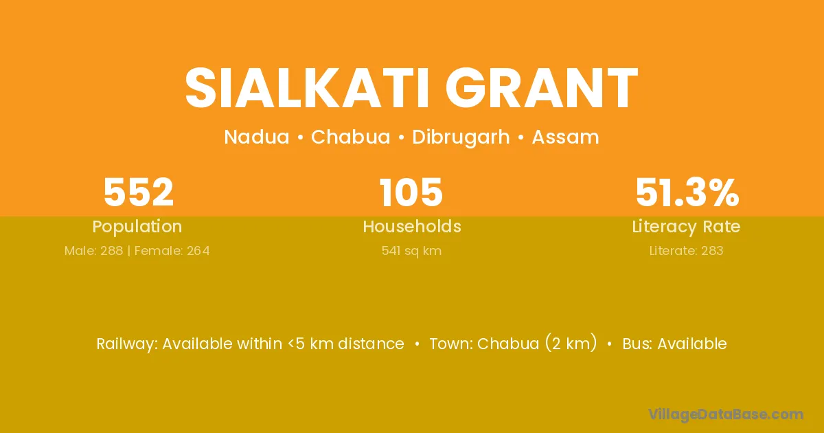 Chabua (2 km) is the nearest town to Sialkati Grant village for major economic activities and is located approximately 2 km away.