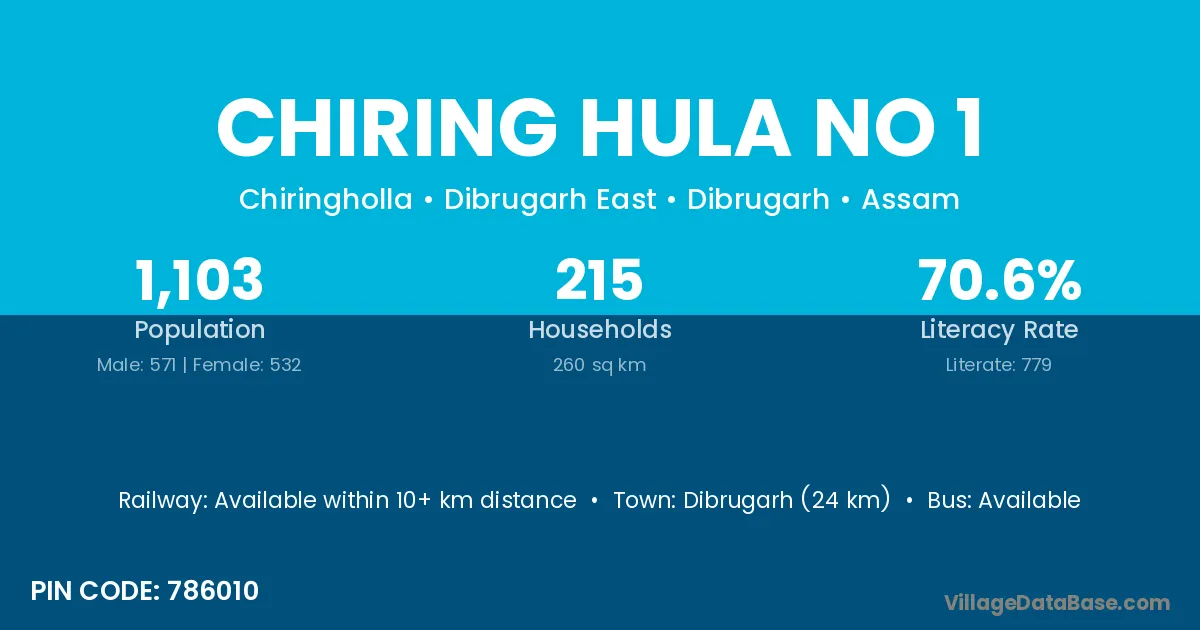 Dibrugarh (24 km) is the nearest town to Chiring Hula No 1 village for major economic activities and is located approximately 24 km away.