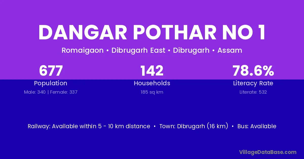 Dibrugarh (16 km) is the nearest town to Dangar Pothar No 1 village for major economic activities and is located approximately 16 km away.
