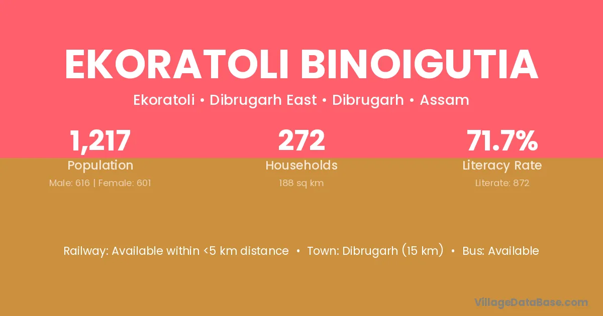 Ekoratoli Binoigutia village has a total population of 1,217 people, of which 616 are males and 601 are females.