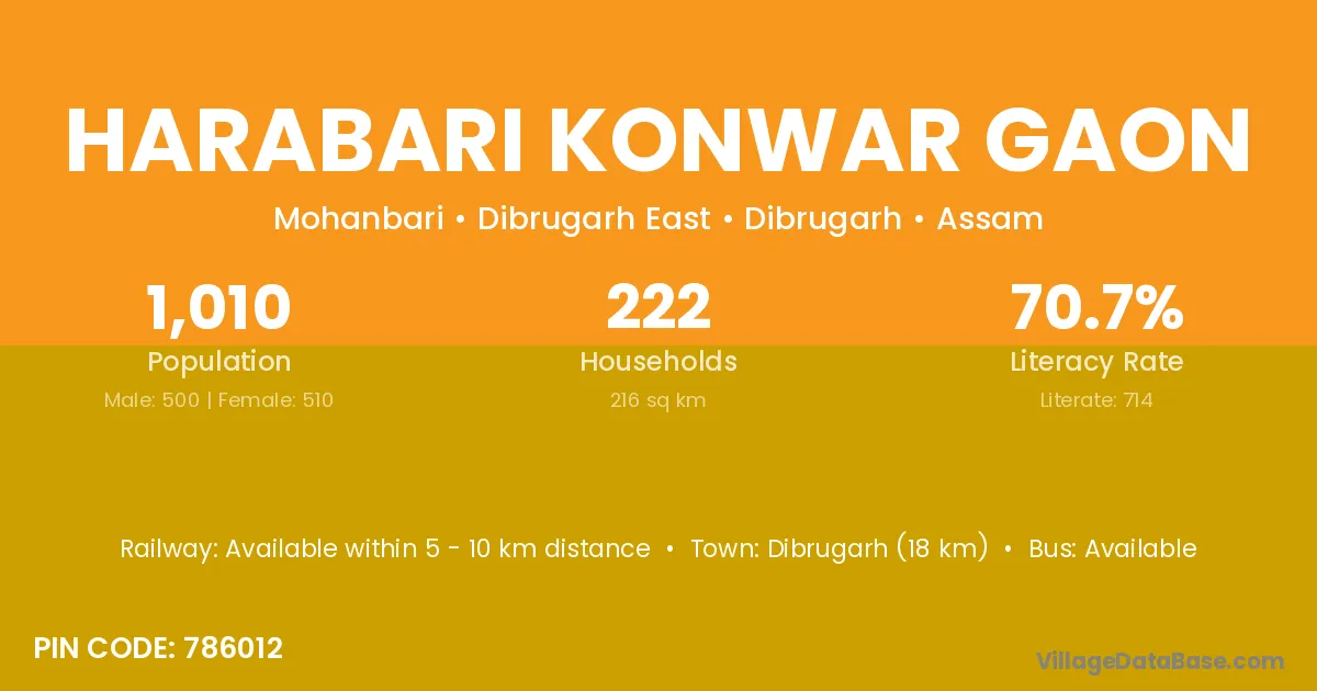 Harabari Konwar Gaon village has a total population of 1,010 people, of which 500 are males and 510 are females.