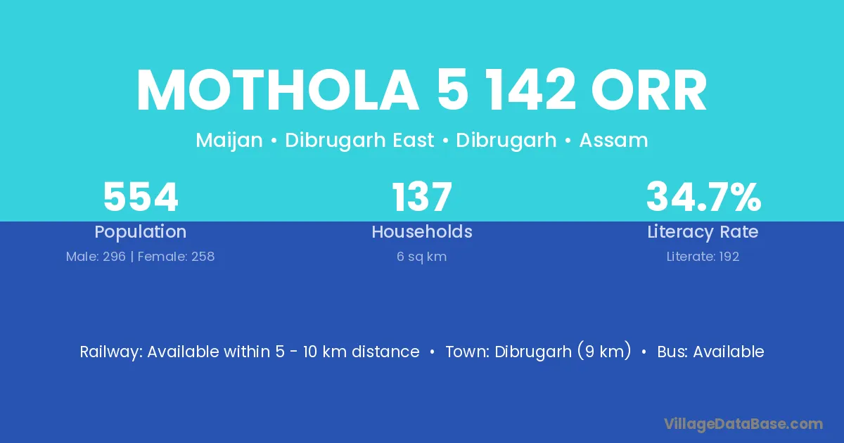 The literacy rate of Mothola 5 142 Orr village is 34.66%. Male literacy stands at 48.31% and female literacy at 18.99%.