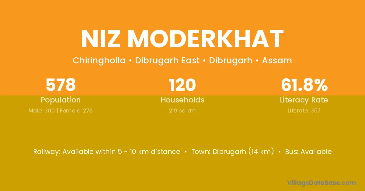 Dibrugarh (14 km) is the nearest town to Niz Moderkhat village for major economic activities and is located approximately 14 km away.