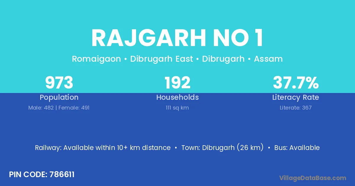 Dibrugarh (26 km) is the nearest town to Rajgarh No 1 village for major economic activities and is located approximately 26 km away.