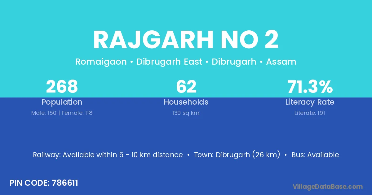 Dibrugarh (26 km) is the nearest town to Rajgarh No 2 village for major economic activities and is located approximately 26 km away.
