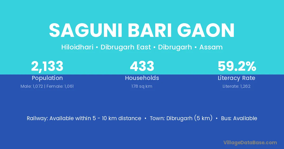 Dibrugarh (5 km) is the nearest town to Saguni Bari Gaon village for major economic activities and is located approximately 5 km away.
