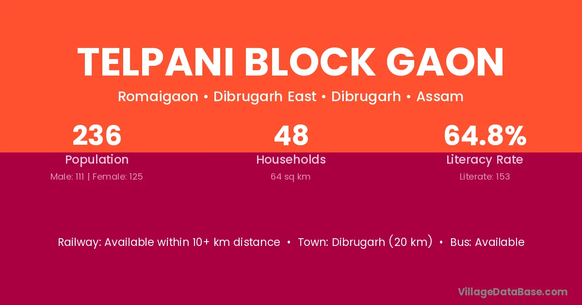 Dibrugarh (20 km) is the nearest town to Telpani Block Gaon village for major economic activities and is located approximately 20 km away.