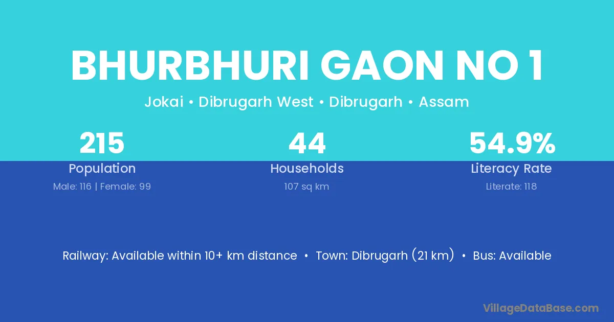 Bhurbhuri Gaon No 1 village has a total population of 215 people, of which 116 are males and 99 are females.