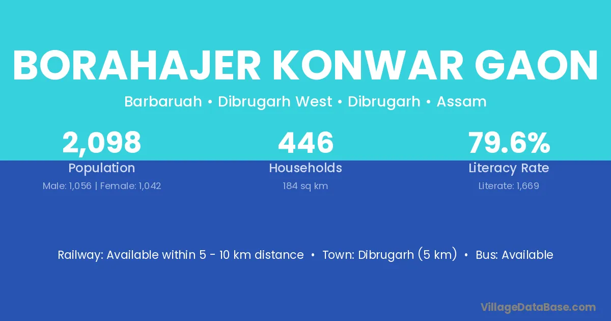 Dibrugarh (5 km) is the nearest town to Borahajer Konwar Gaon village for major economic activities and is located approximately 5 km away.