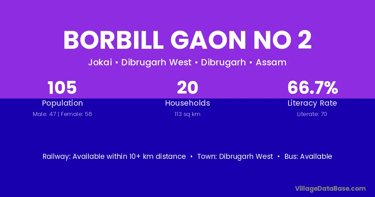 Borbill Gaon No 2 village has a total population of 105 people, of which 47 are males and 58 are females.