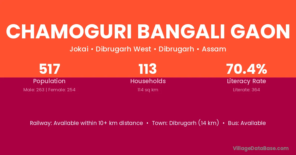Chamoguri Bangali Gaon village has a total population of 517 people, of which 263 are males and 254 are females.
