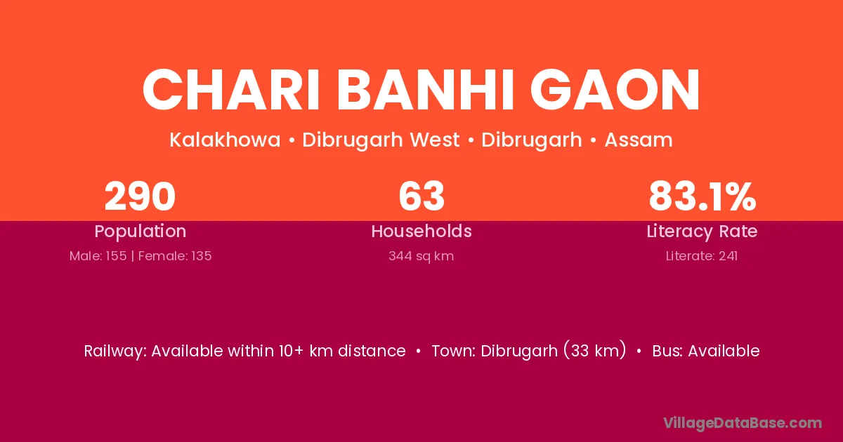 Dibrugarh (33 km) is the nearest town to Chari Banhi Gaon village for major economic activities and is located approximately 33 km away.