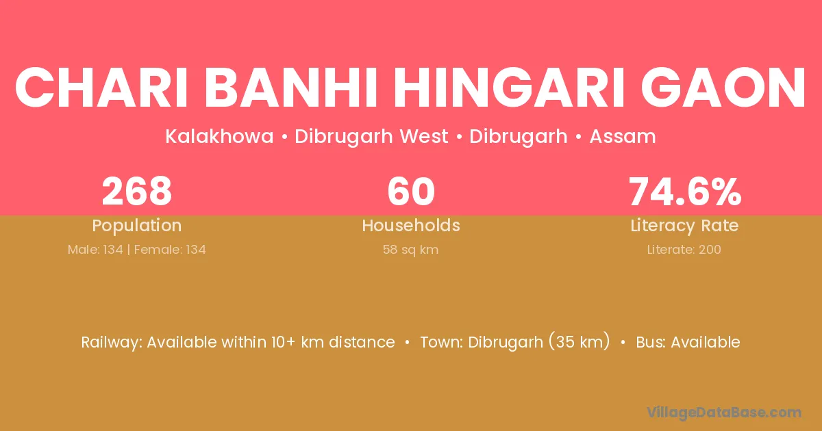 Dibrugarh (35 km) is the nearest town to Chari Banhi Hingari Gaon village for major economic activities and is located approximately 35 km away.