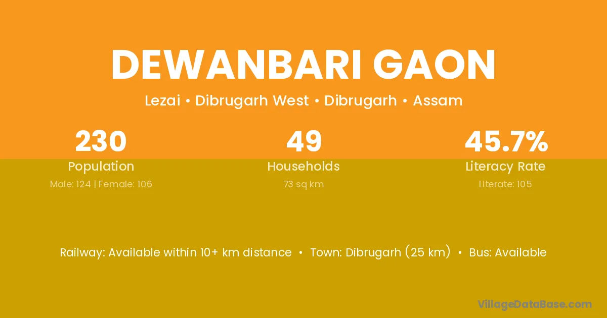 Dewanbari Gaon village has a total population of 230 people, of which 124 are males and 106 are females.