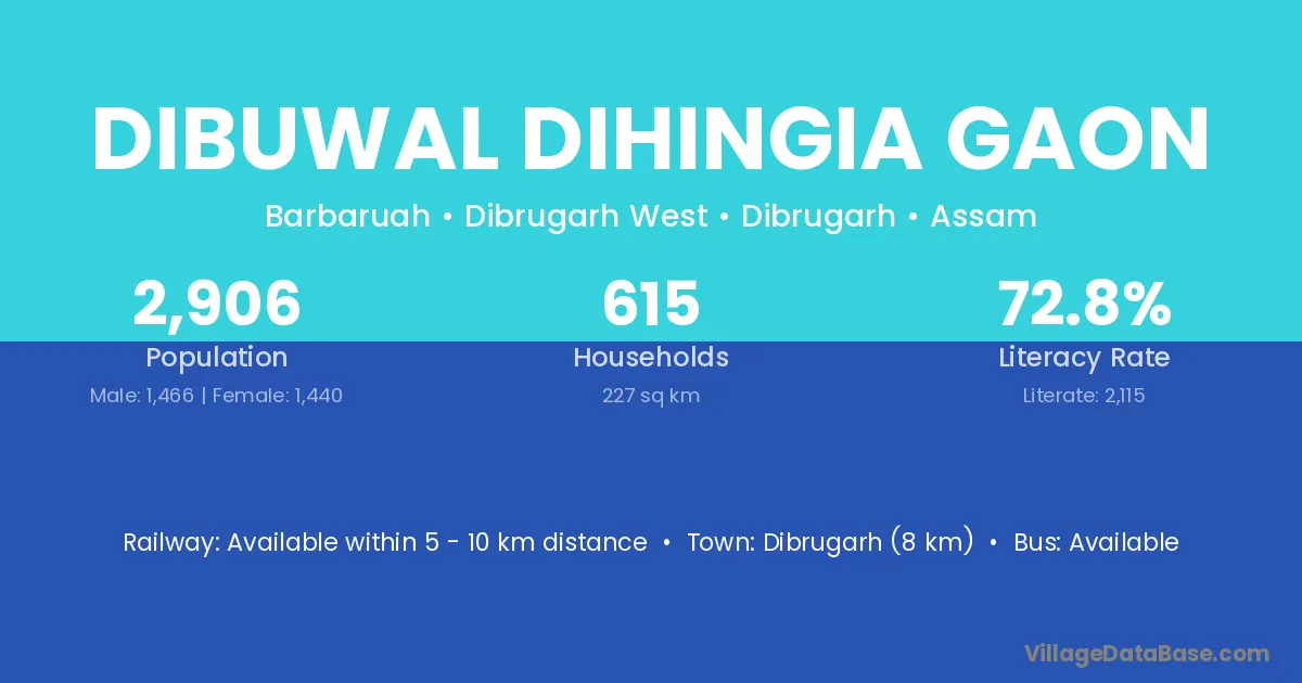 Dibuwal Dihingia Gaon village has a total population of 2,906 people, of which 1,466 are males and 1,440 are females.
