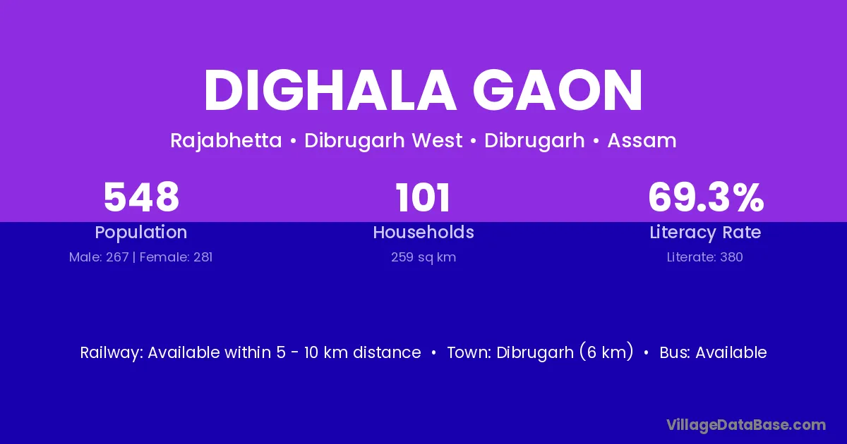 Dibrugarh (6 km) is the nearest town to Dighala Gaon village for major economic activities and is located approximately 6 km away.