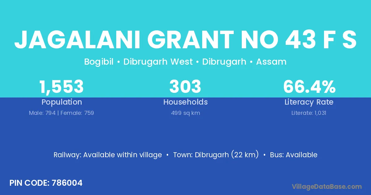 Dibrugarh (22 km) is the nearest town to Jagalani Grant No 43 F S village for major economic activities and is located approximately 22 km away.