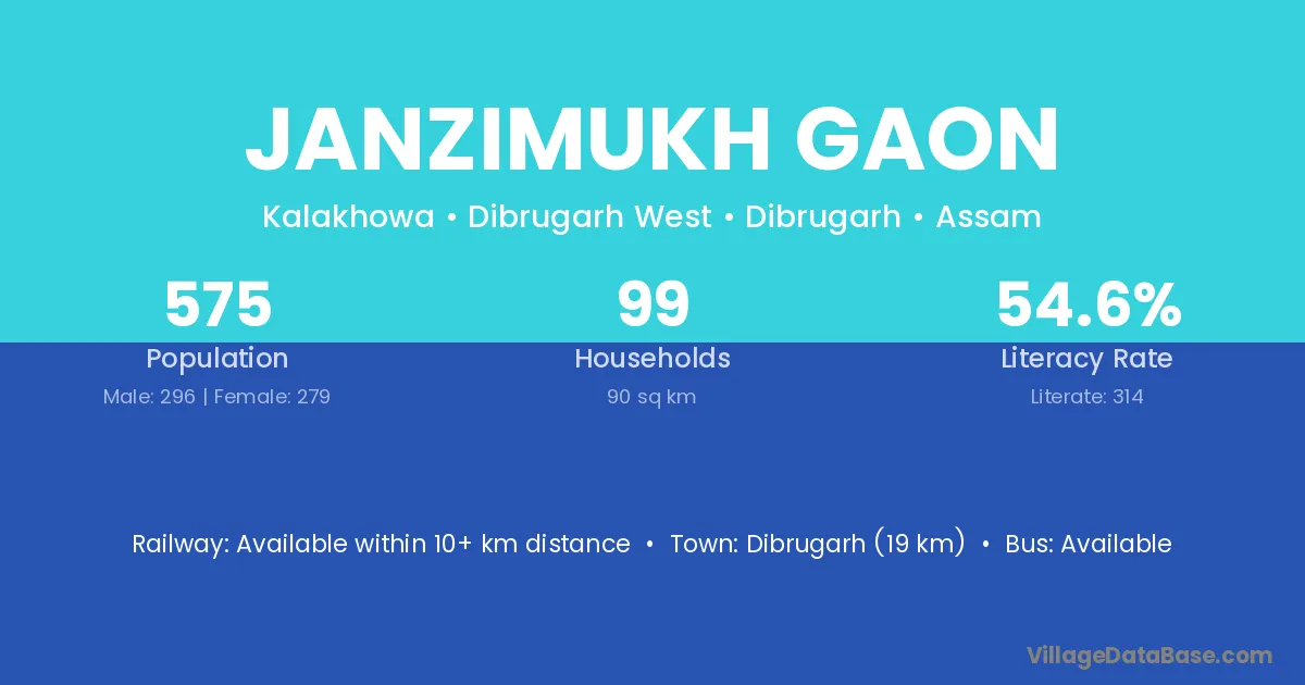 Janzimukh Gaon village has a total population of 575 people, of which 296 are males and 279 are females.