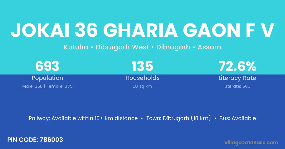 Jokai 36 Gharia Gaon F V village has a total population of 693 people, of which 358 are males and 335 are females.
