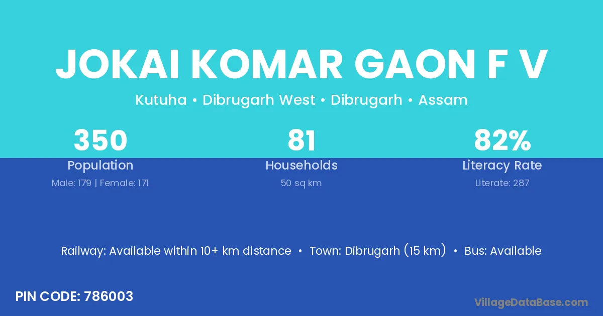 Dibrugarh (15 km) is the nearest town to Jokai Komar Gaon F V village for major economic activities and is located approximately 15 km away.