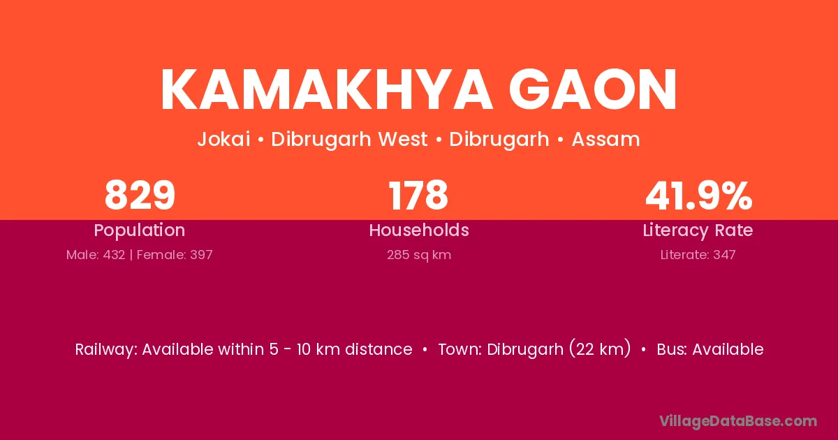 Kamakhya Gaon village has a total population of 829 people, of which 432 are males and 397 are females.