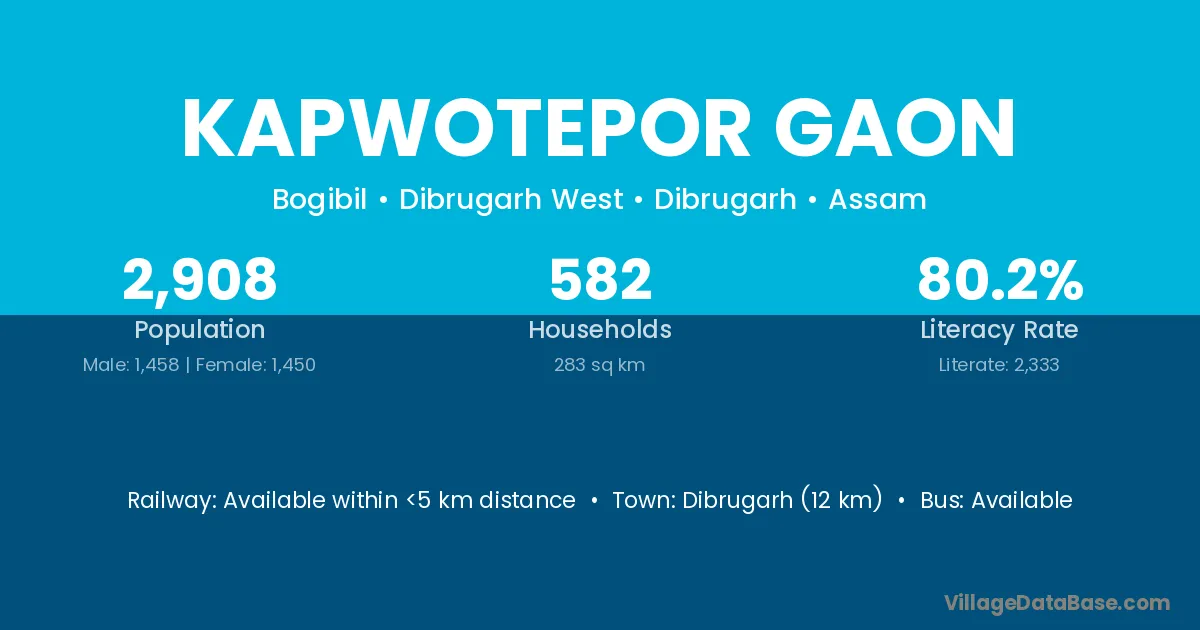 Dibrugarh (12 km) is the nearest town to Kapwotepor Gaon village for major economic activities and is located approximately 12 km away.