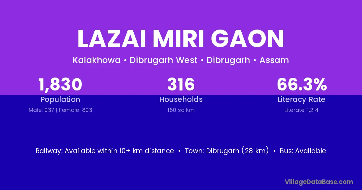 Dibrugarh (28 km) is the nearest town to Lazai Miri Gaon village for major economic activities and is located approximately 28 km away.
