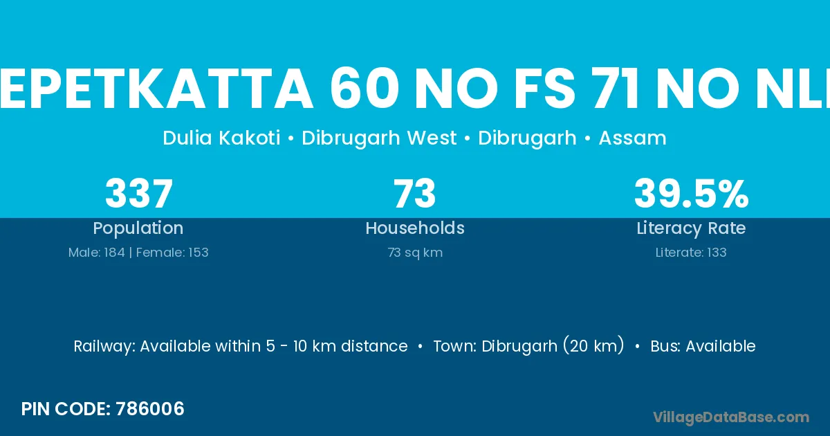 Dibrugarh (20 km) is the nearest town to Lepetkatta 60 No Fs 71 No Nlr village for major economic activities and is located approximately 20 km away.