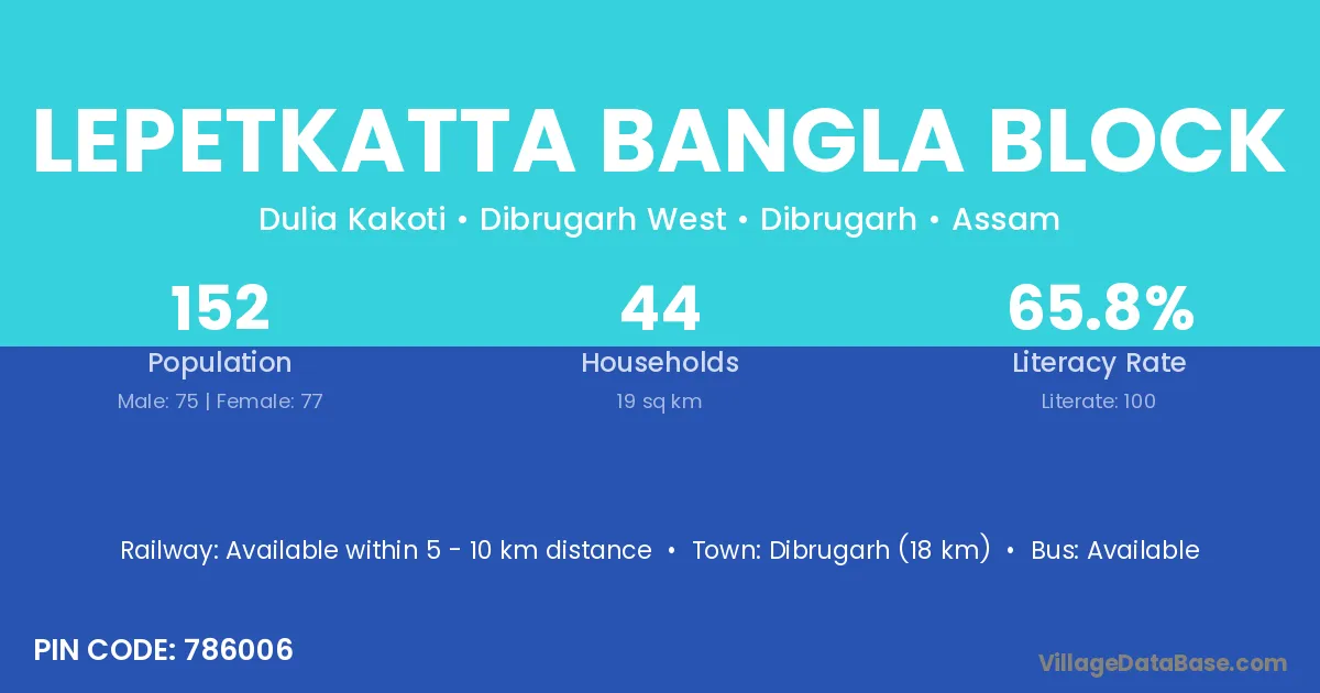 Dibrugarh (18 km) is the nearest town to Lepetkatta Bangla Block village for major economic activities and is located approximately 18 km away.