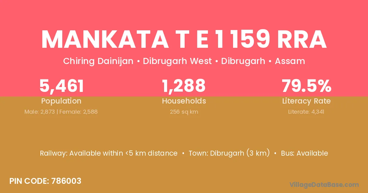 Dibrugarh (3 km) is the nearest town to Mankata T E 1 159 Rra village for major economic activities and is located approximately 3 km away.