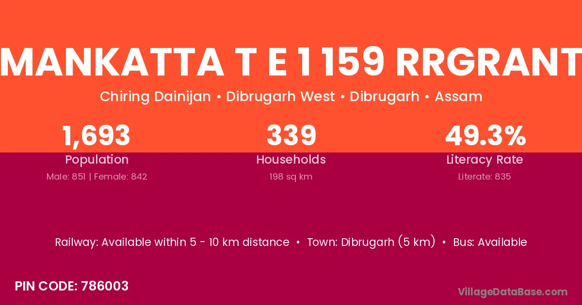 Dibrugarh (5 km) is the nearest town to Mankatta T E 1 159 Rrgrant village for major economic activities and is located approximately 5 km away.