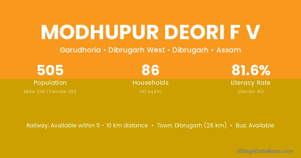 Dibrugarh (26 km) is the nearest town to Modhupur Deori F V village for major economic activities and is located approximately 26 km away.