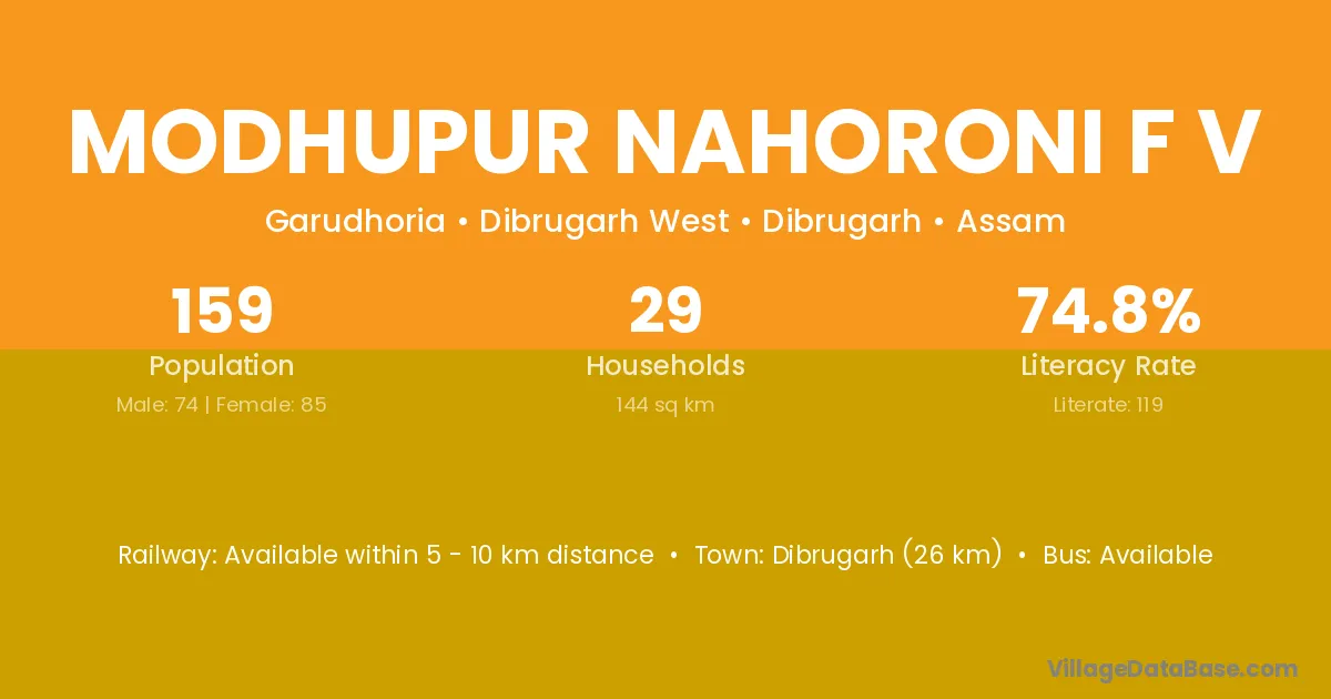 Dibrugarh (26 km) is the nearest town to Modhupur Nahoroni F V village for major economic activities and is located approximately 26 km away.