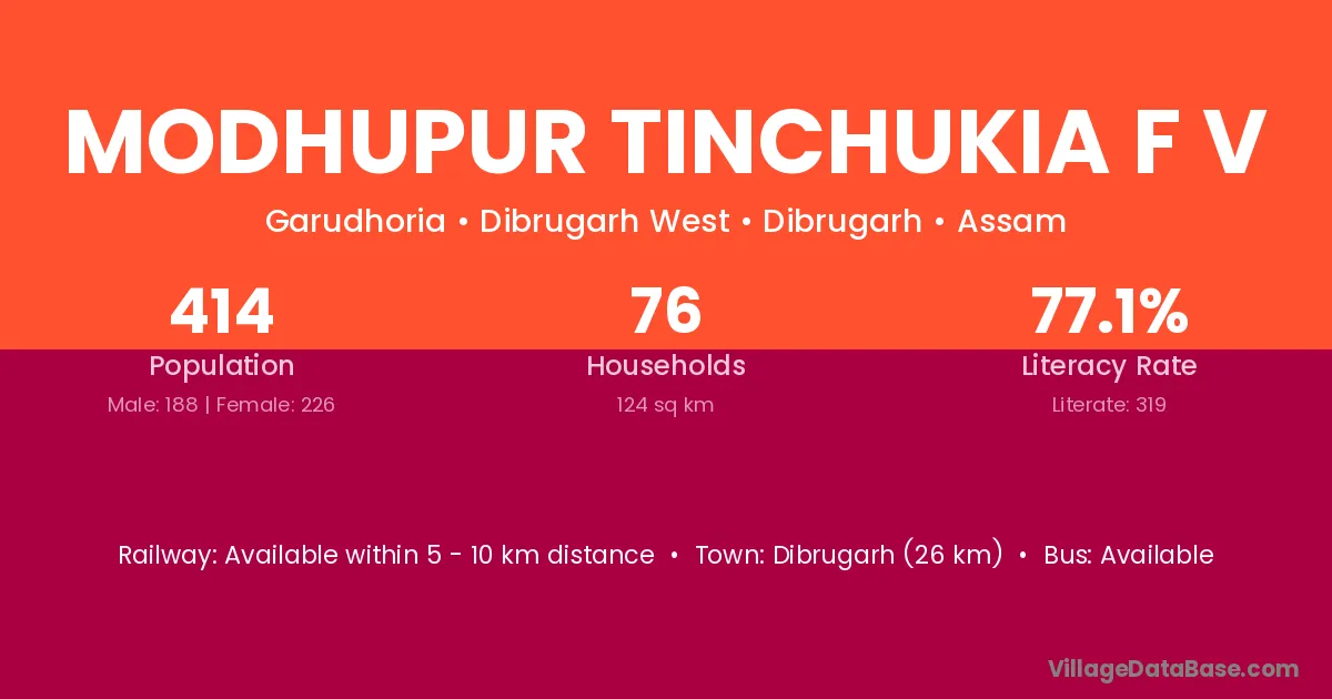 Dibrugarh (26 km) is the nearest town to Modhupur Tinchukia F V village for major economic activities and is located approximately 26 km away.