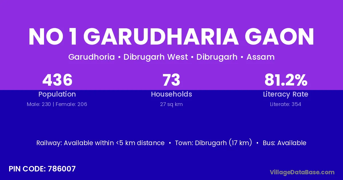 No 1 Garudharia Gaon village has a total population of 436 people, of which 230 are males and 206 are females.