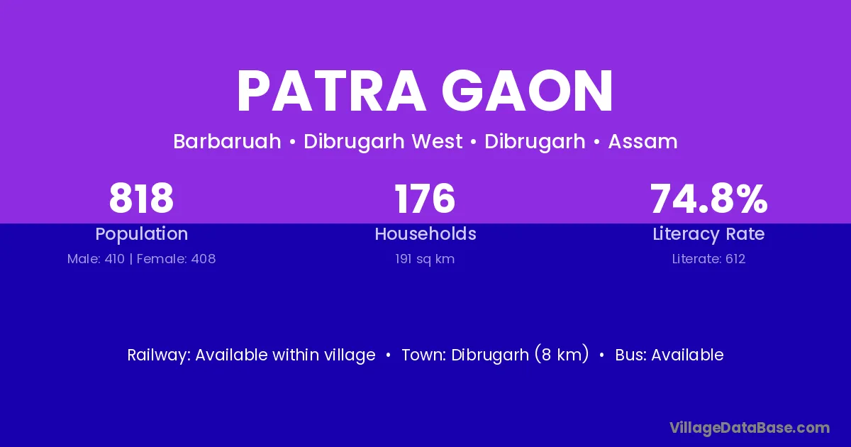 Dibrugarh (8 km) is the nearest town to Patra Gaon village for major economic activities and is located approximately 8 km away.