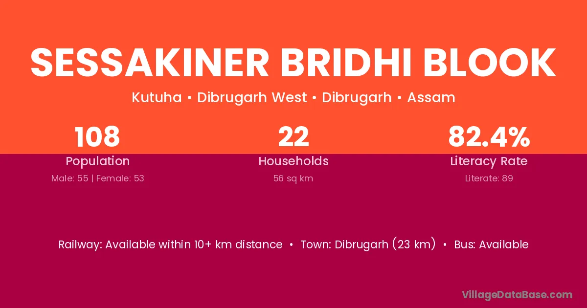 Dibrugarh (23 km) is the nearest town to Sessakiner Bridhi Blook village for major economic activities and is located approximately 23 km away.