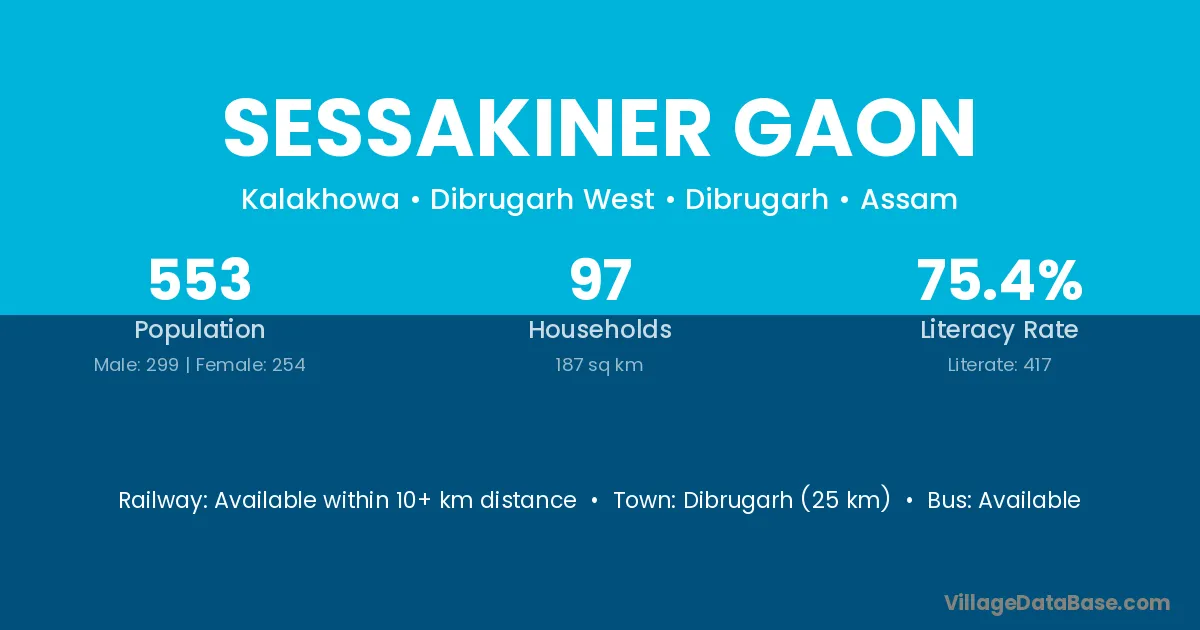 Dibrugarh (25 km) is the nearest town to Sessakiner Gaon village for major economic activities and is located approximately 25 km away.