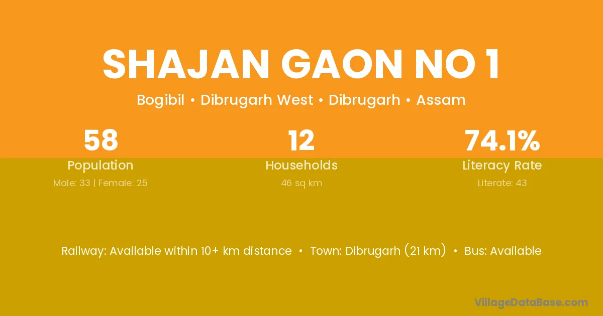 Dibrugarh (21 km) is the nearest town to Shajan Gaon No 1 village for major economic activities and is located approximately 21 km away.