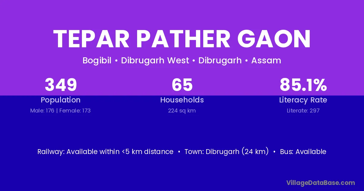 Dibrugarh (24 km) is the nearest town to Tepar Pather Gaon village for major economic activities and is located approximately 24 km away.
