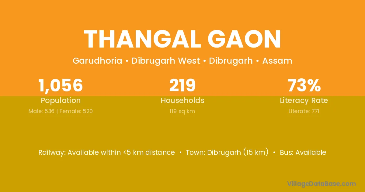 Dibrugarh (15 km) is the nearest town to Thangal Gaon village for major economic activities and is located approximately 15 km away.