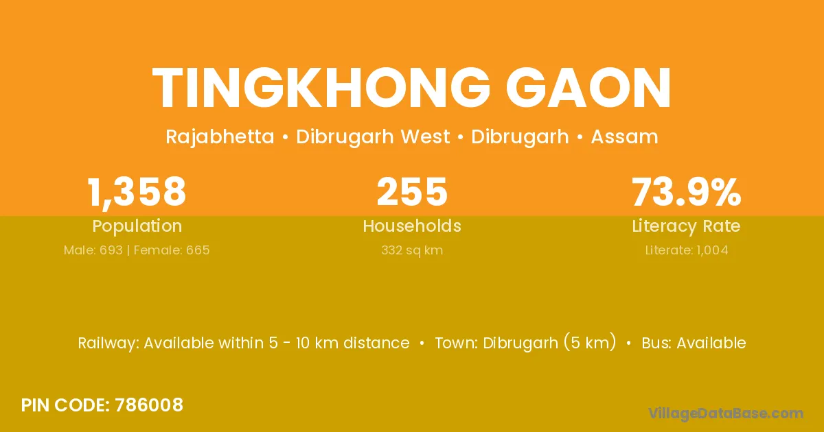 Tingkhong Gaon village has a total population of 1,358 people, of which 693 are males and 665 are females.