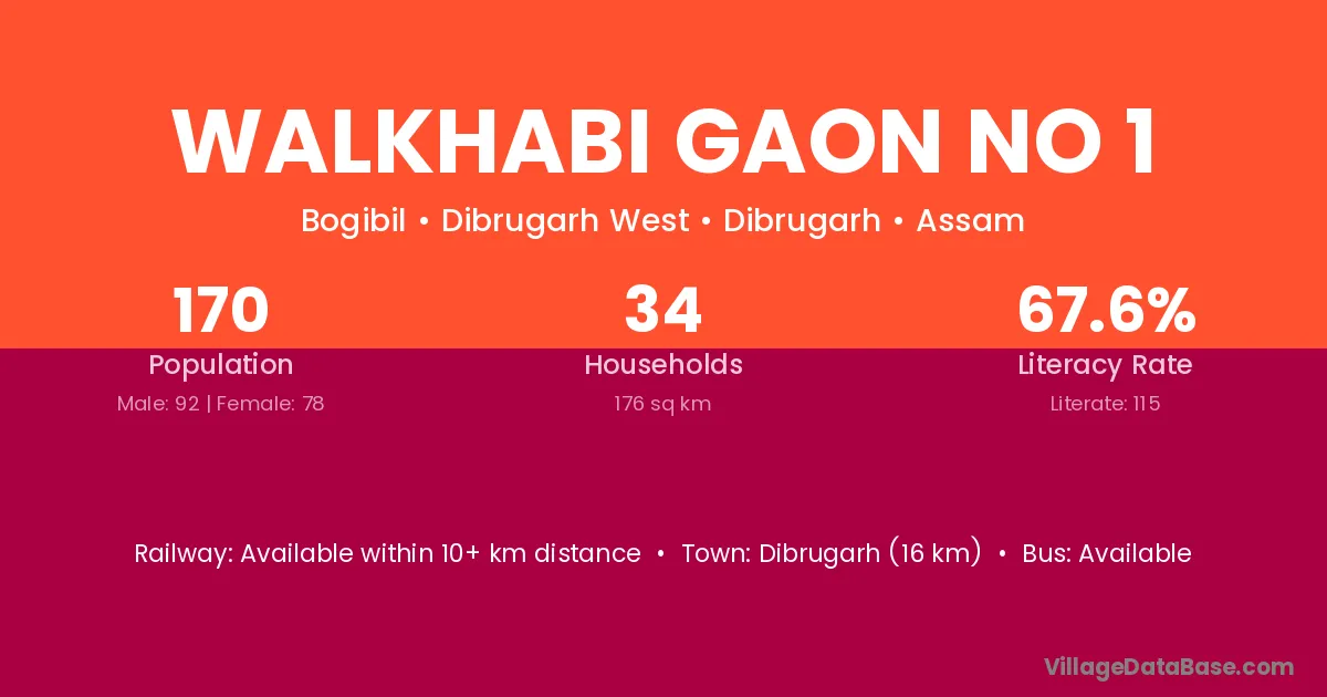 Dibrugarh (16 km) is the nearest town to Walkhabi Gaon No 1 village for major economic activities and is located approximately 16 km away.