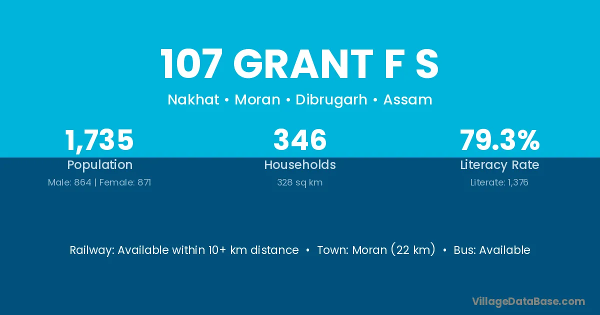 107 Grant F S village has a total population of 1,735 people, of which 864 are males and 871 are females.