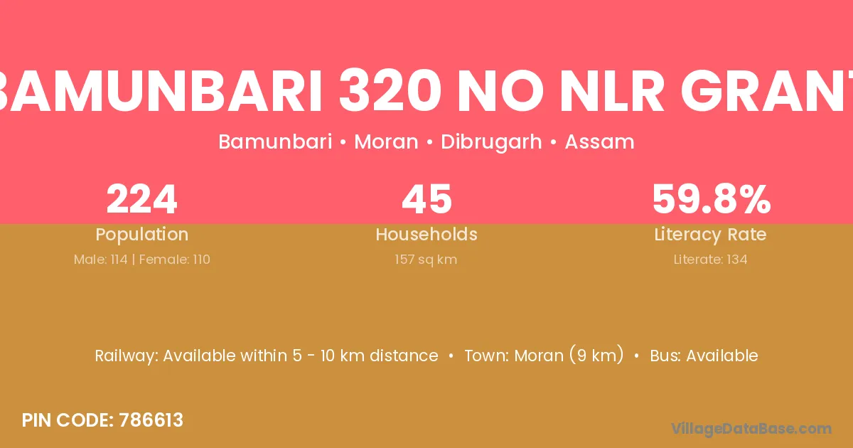 Moran (9 km) is the nearest town to Bamunbari 320 No Nlr Grant village for major economic activities and is located approximately 9 km away.