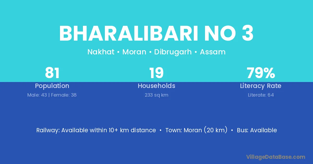 Moran (20 km) is the nearest town to Bharalibari No 3 village for major economic activities and is located approximately 20 km away.
