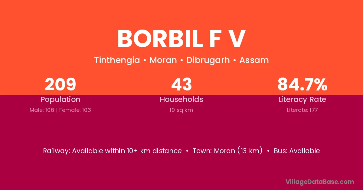 Moran (13 km) is the nearest town to Borbil F V village for major economic activities and is located approximately 13 km away.