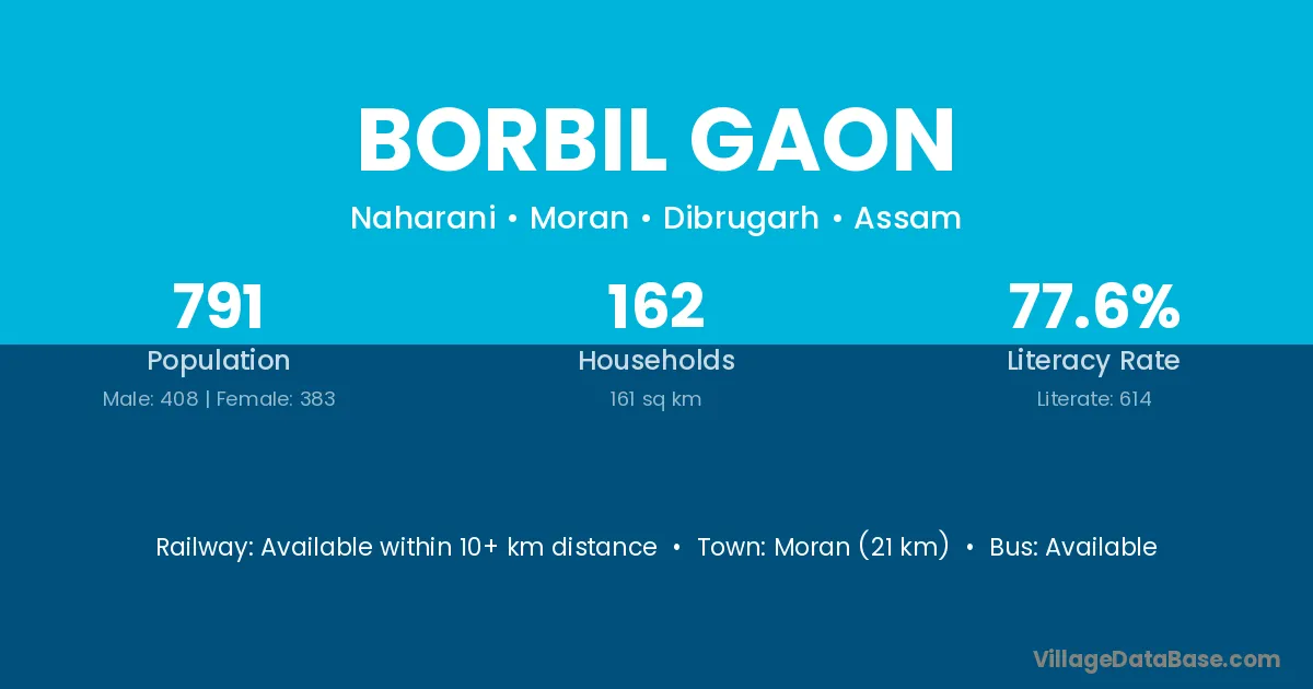 Moran (21 km) is the nearest town to Borbil Gaon village for major economic activities and is located approximately 21 km away.