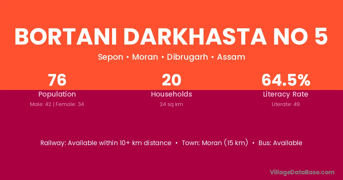 Bortani Darkhasta No 5 village is located in the Moran Subdivision of the Dibrugarh district in Assam .
